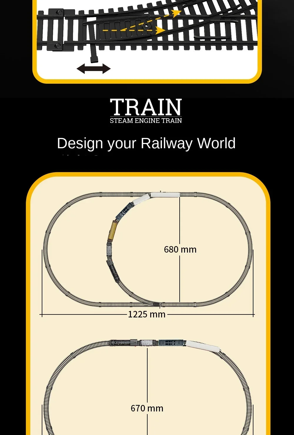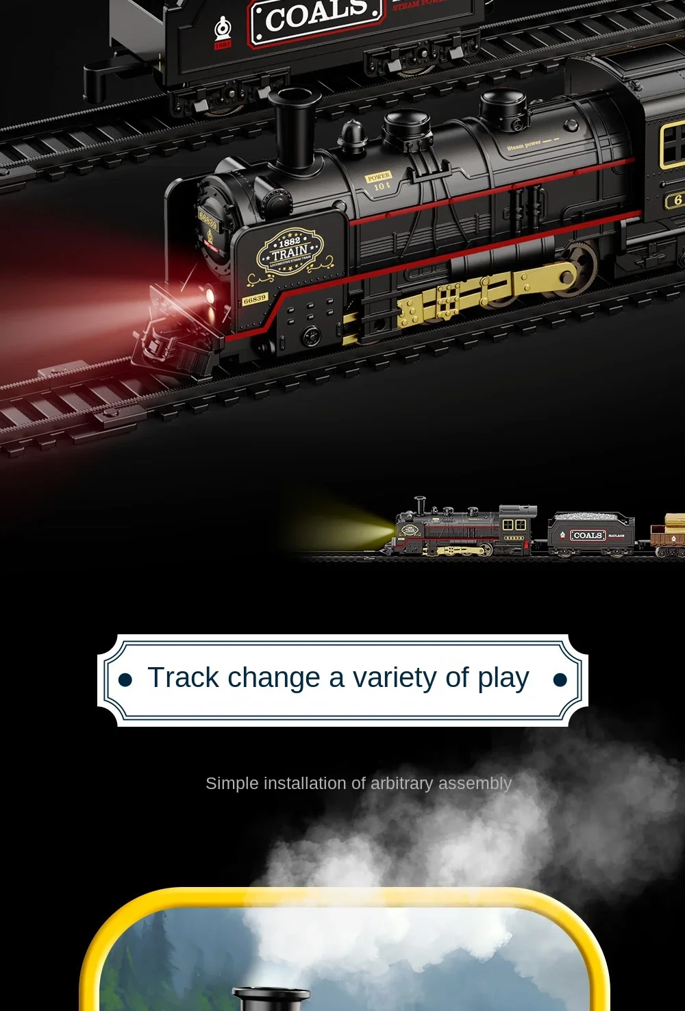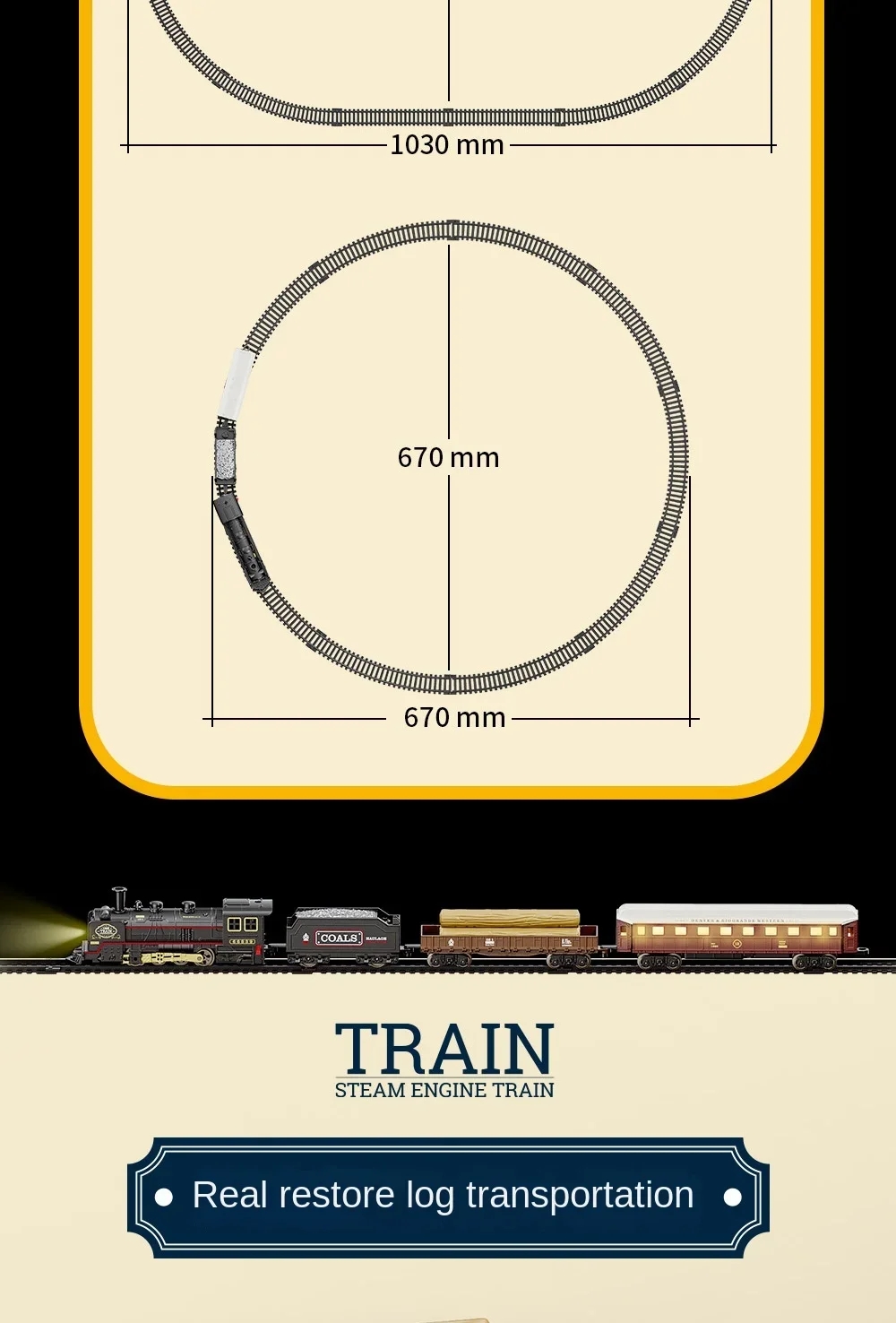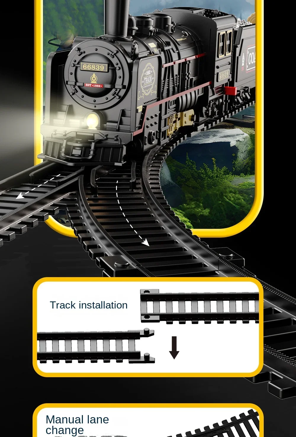 BZS00678HS1: Vintage train model track car - Electric locomotive automatically runs along the track; One electrically operated train with an on/off switch; Including lighting effects and train imitation sound effects; Use 2 1.5V"AA" non-rechargeable batteries, not included in the battery pack. Two carriages with sliding function; Ten assemblable tracks.