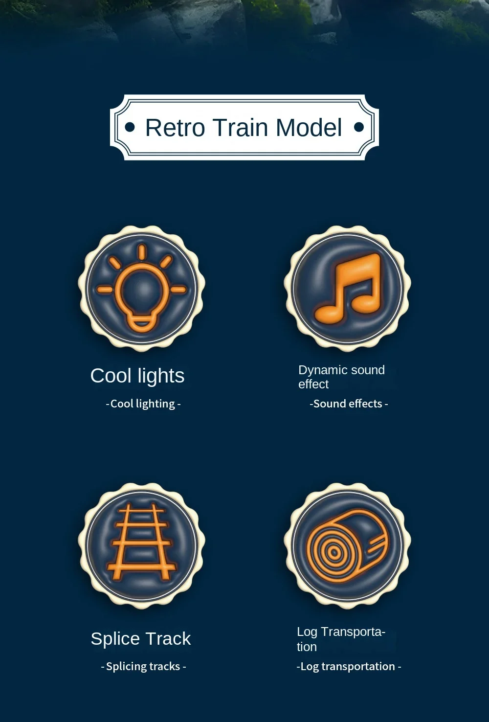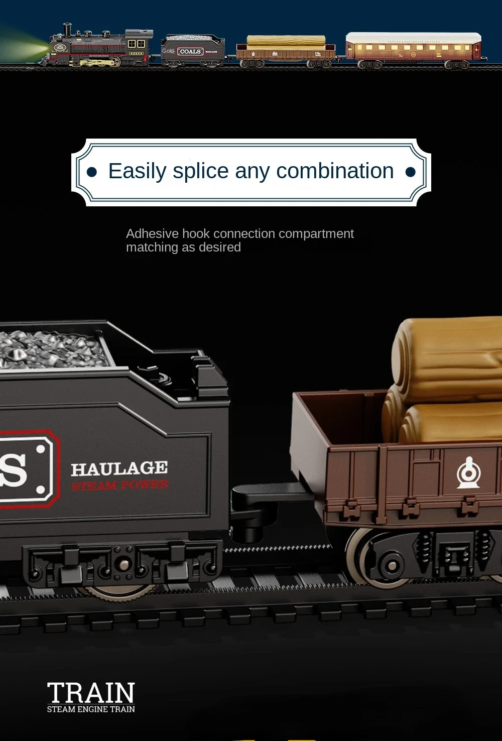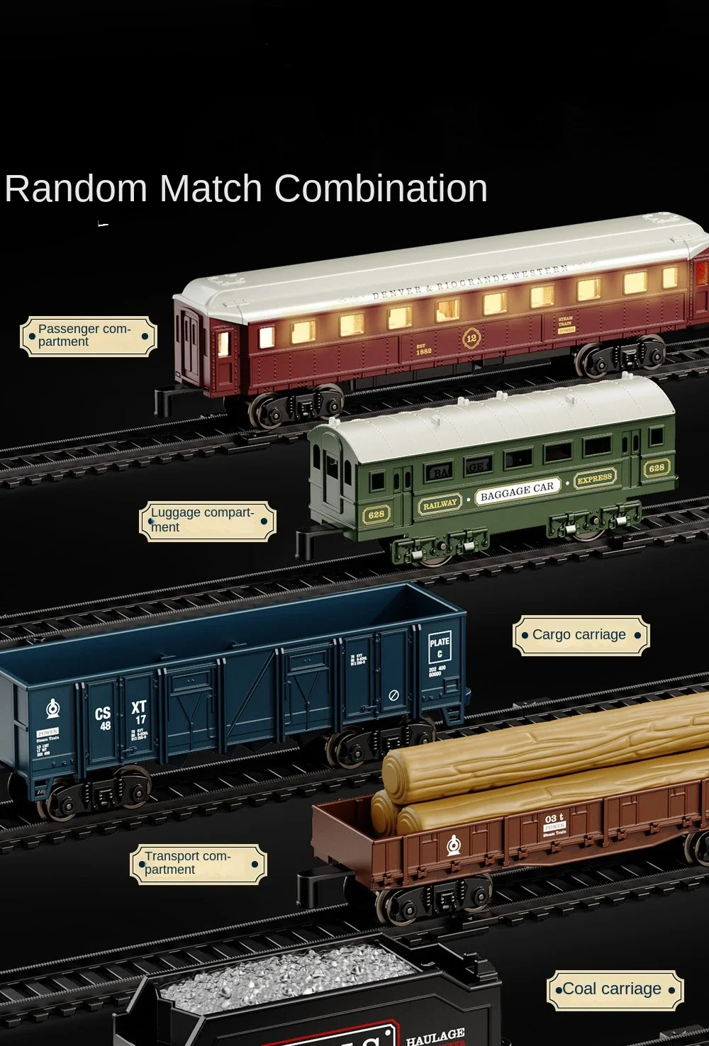 BZS00678HS3: Vintage train model track car - Electric locomotive automatically runs along the track; One electrically operated train with an on/off switch; Including lighting effects and train imitation sound effects; Use 2 1.5v"AA" non-rechargeable batteries, not included in the battery pack. Four carriages with sliding function; 1 carriage with sliding function, including lighting, uses 3 "1.5V AG3/LR41" button batteries for battery pack.